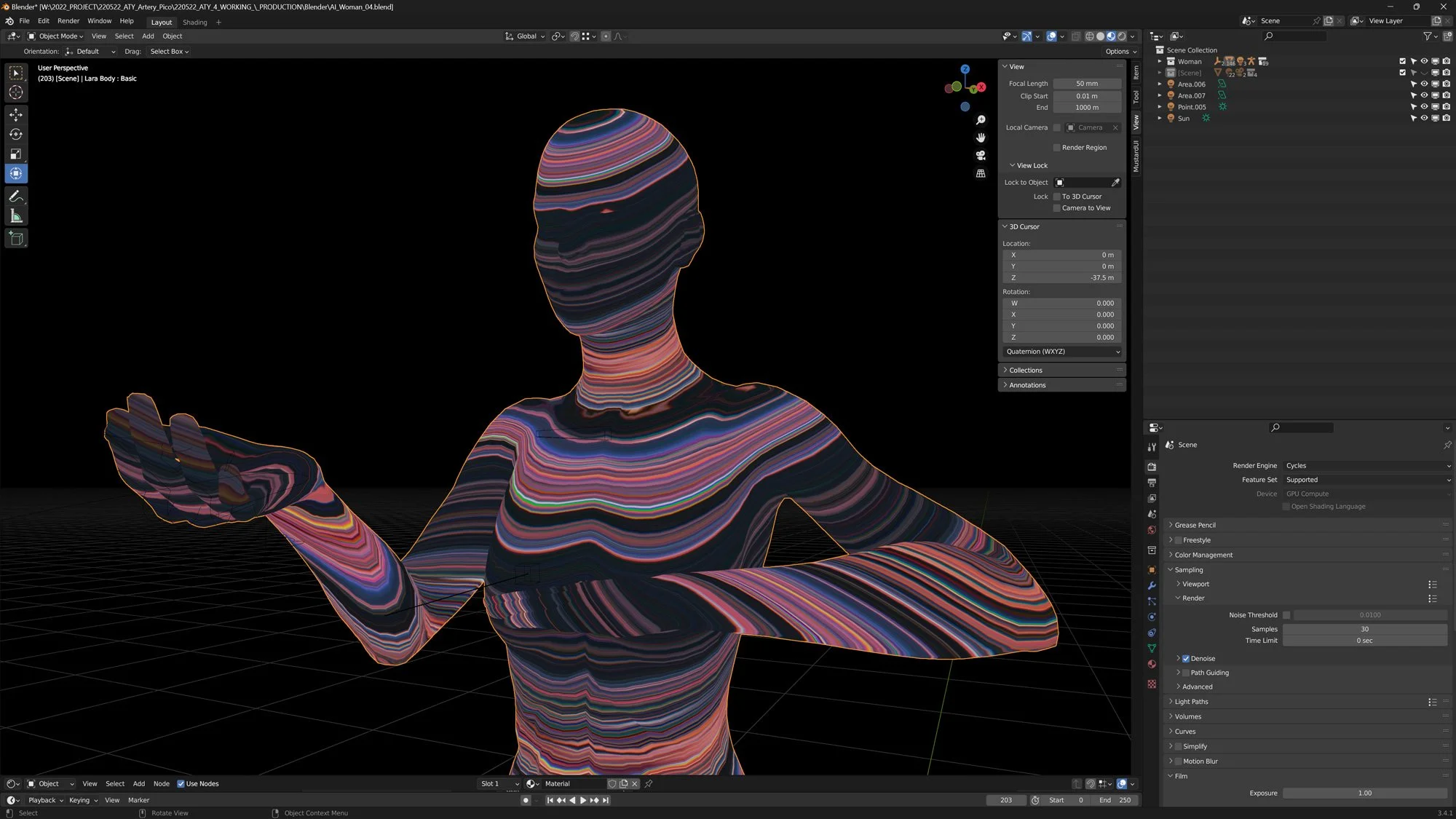 The following images showcase the environment and AI human set up in blender. Since there were multiple camera angles it was important to have a 3D space to work within. That way any changes required would work for all different angles.